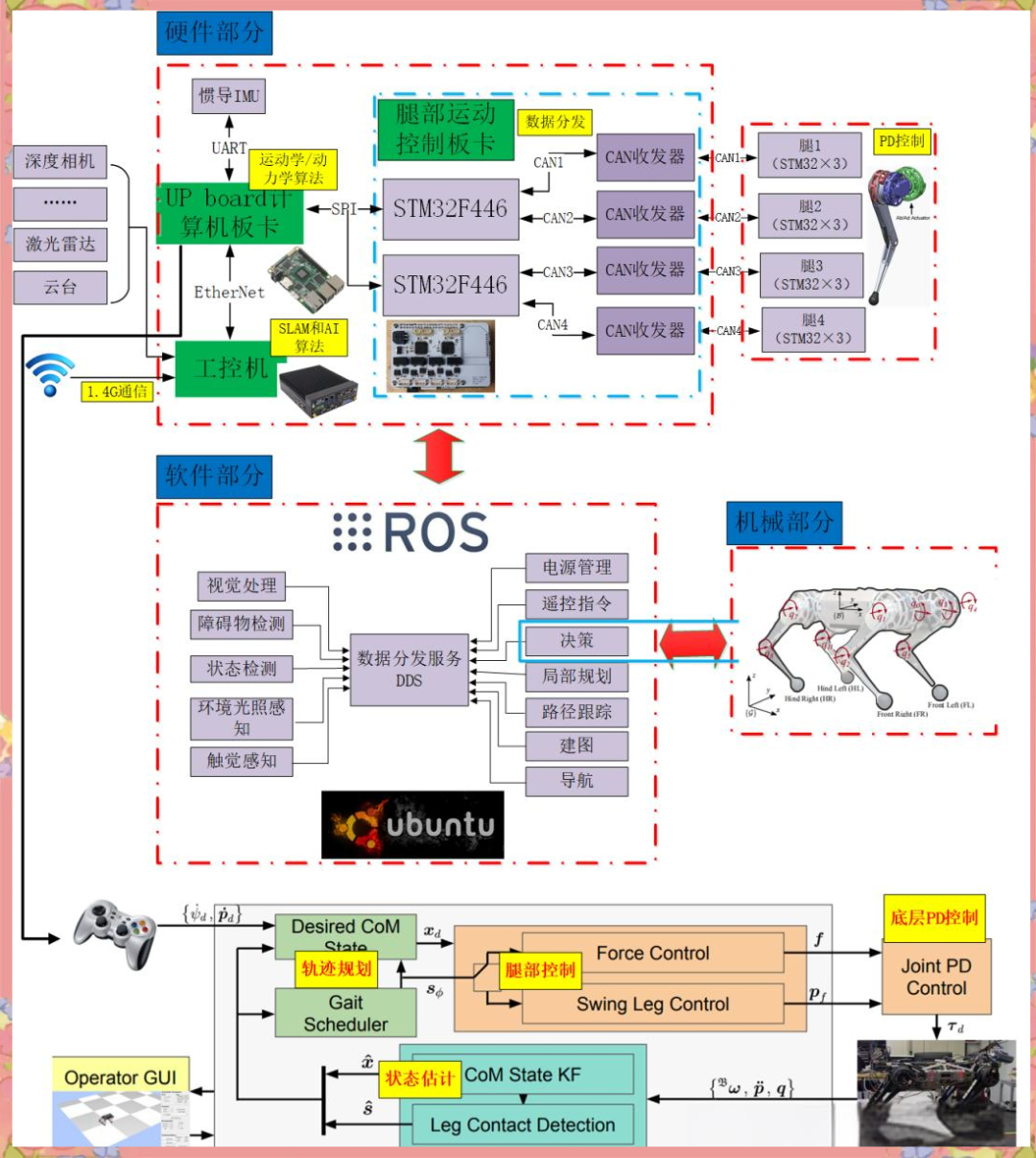 机械狗主要涉及到三大核心领域:机械机构设计、硬件电路设计,以及控制算法与感知决策算法的设计。在硬件模块方面,机械狗的机身结构采用铝合金和塑料材质,既保证了轻量化又确保了高强度,其设计灵感源于仿生学,从而赋予了机器狗出色的运动能力。此外,机械狗还配备了高性能伺服电机,支持多自由度运动,使得它能轻松完成复杂的动作和姿态控制。