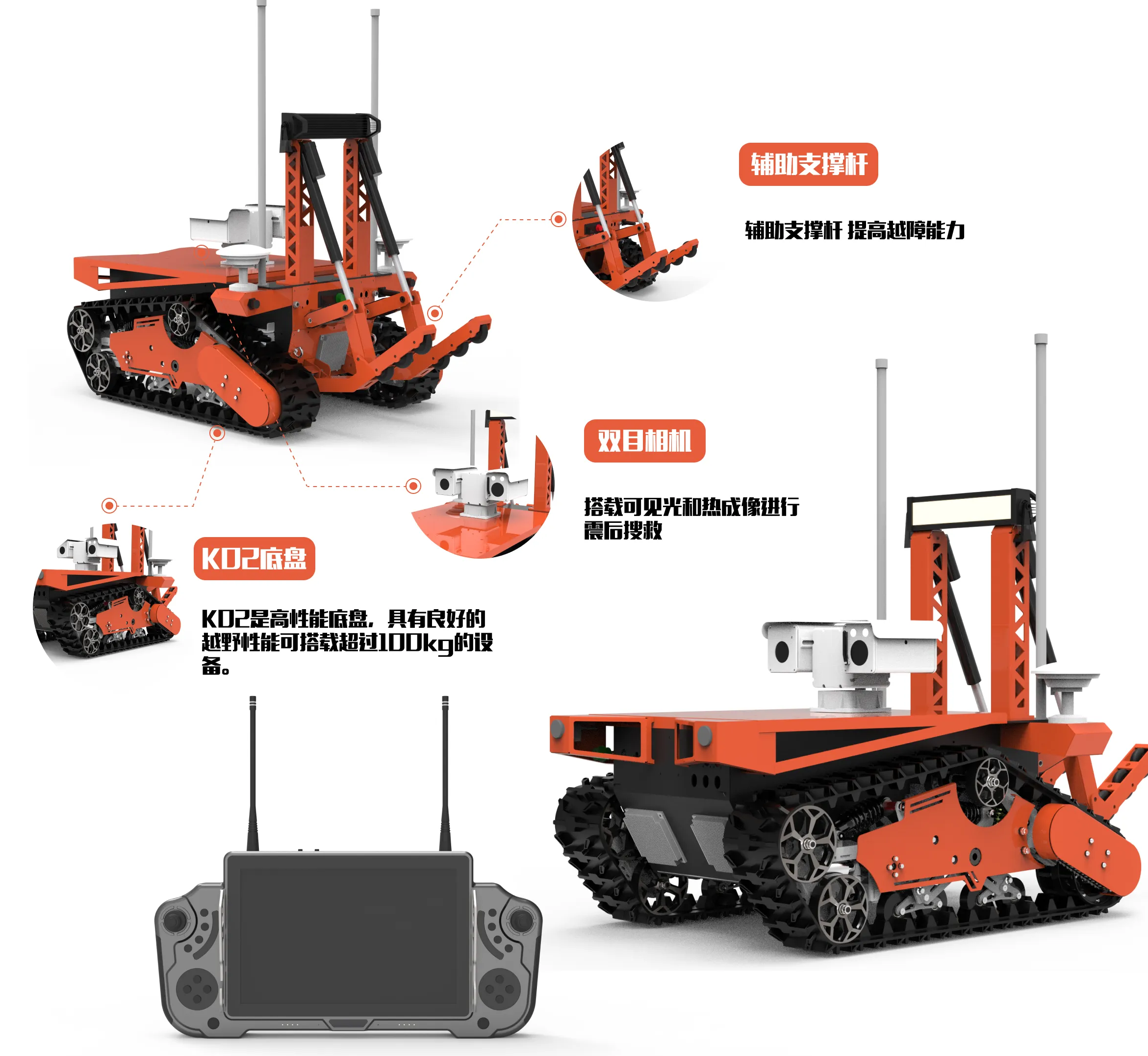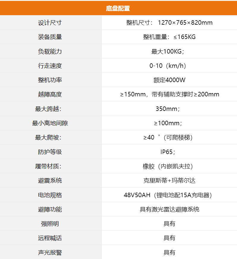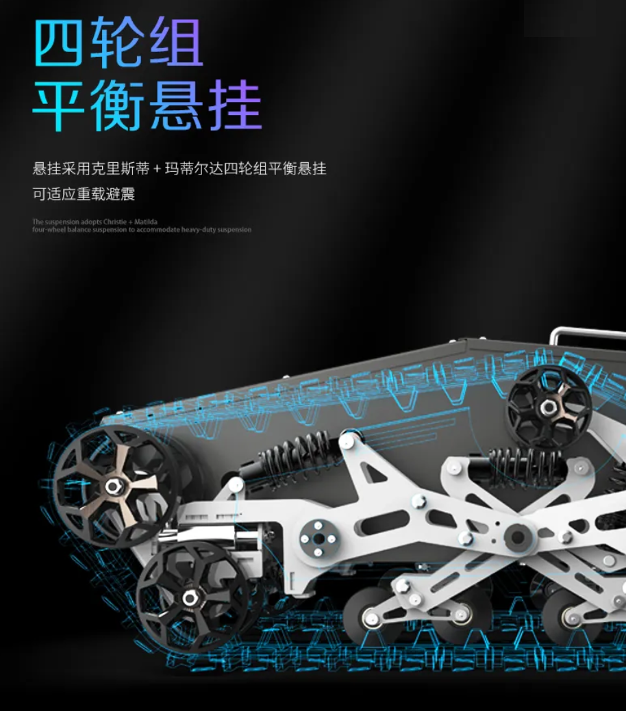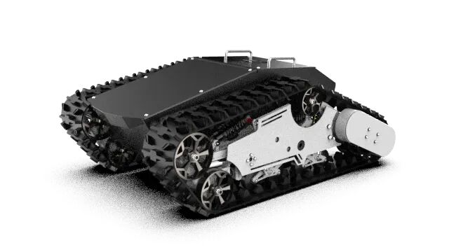 运动性能强大的通用型履带式机器人底盘,整车采用克里斯蒂全独立悬挂设计,内部搭载高扭矩无刷电机,通过精心匹配的底盘高度和功率配置,底盘表现出卓越的通过性能、低重心、平稳运行以及高效的传动效率,这使得它成为各行业设备移动方案的理想选择,例如在侦查、巡检、勘探、消防等特种机器人行业中具备广泛的应用前景。
