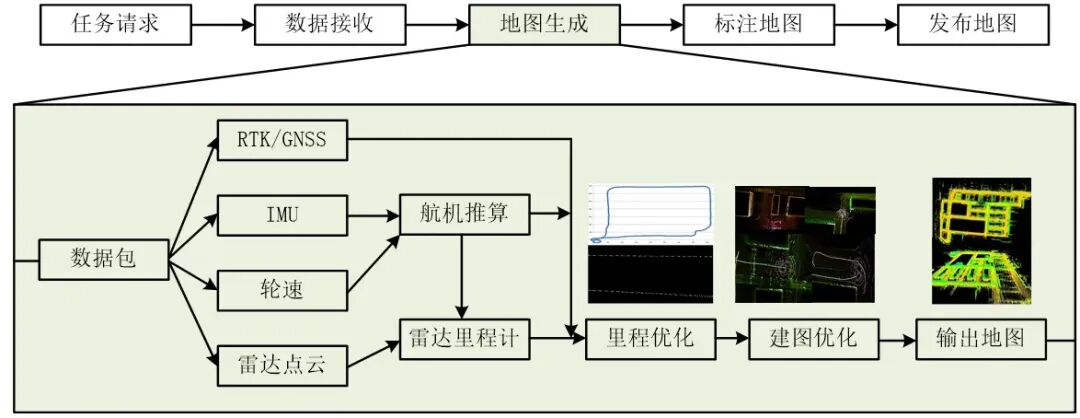 高精度点云地图是实现高精度定位的必要条件,建图的过程包括:建图任务请求、不同传感器的数据收集、生成点云地图、标注地图、发布自动驾驶使用的地图。其中最为关键的是生成高精度的点云地图。