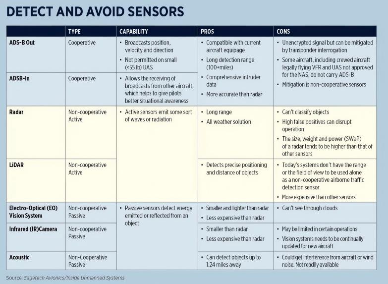 ADS-B(广播式自动相关监视)、远程ID和共享飞机位置等合作空域技术将变得至关重要。协作传感器使空域冲突的解决变得更加容易,但并非所有飞机都配备了 ADS-B。非合作飞机:许多飞机不使用 ADS-B 通信来报告其位置,这些飞机被称为非合作飞机。包括热气球在内的所有飞机中,有多达 30% 到 70% 不使用 ADS-B。DAA传感比较:(ADS-B、雷达、激光雷达、可见光等)