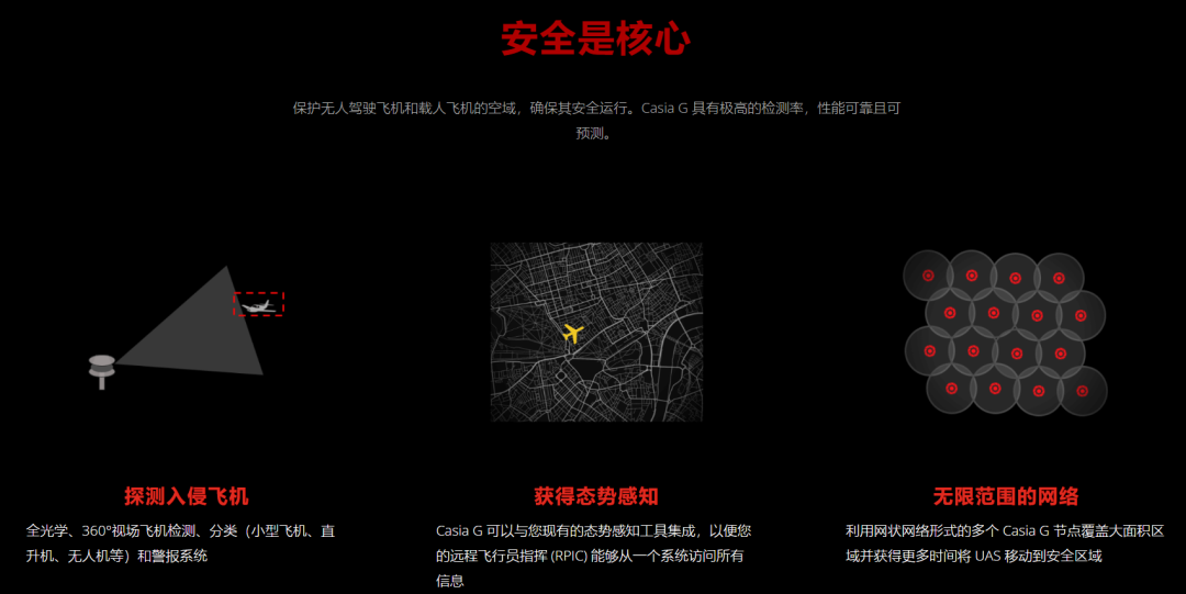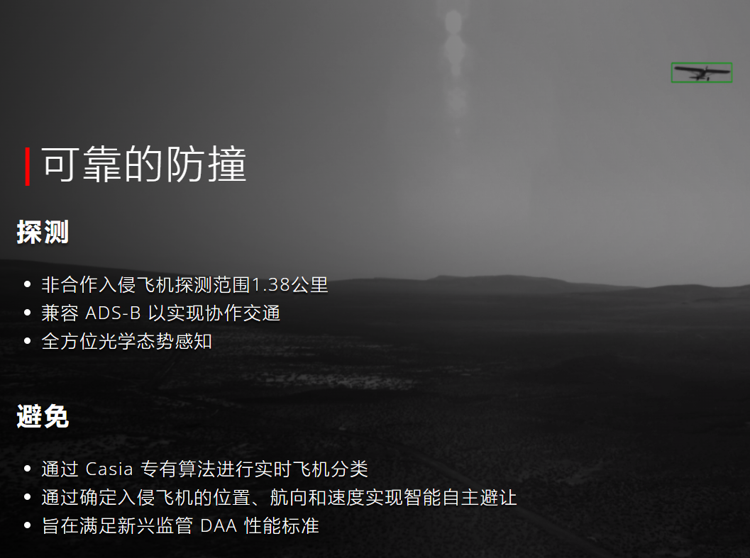 通过人工智能算法实现检测和分类潜在障碍物并使无人机能够避开它们。最初的 Casia 是一款单摄像头系统,通常安装在飞机机头上,该系统水平视角为 80 度,垂直视角为 50 度。相比之下,Casia X 最多可搭载 5-6 个摄像头视野达到了 360 度。能够同时跟踪多达 60 架飞机或其他潜在障碍物。每个 Casia 系统都配有 ADS-B 接收器。Casia X 可安装在大型飞机上,包括有人驾驶的通用航空飞机。利用 Casia 的警报来检测潜在危险,然后通过来自危险所在方向的音频提示向飞行员发出警报。Casia 也专注于这项任务——它所做的就是追踪潜在危险。空中 Casias 可搭载在大型飞机上,例如直升机、空中出租车或大型无人机。对于无法搭载此类系统的小型飞机,还有地面版本 Casia G。人工智能软件会寻找飞机、无人机等动态物体,并跟踪它们,了解它们的包括分类、位置、高度、航向等数据。如果Casia 安装在飞机上,并且飞机正在自主飞行,可以命令自动驾驶仪采取规避动作,并且向远程飞行员发出警报。远程飞行员及其地面站将能够看到远程触发飞机相对于无人机的位置,以及两者的移动方式,并可能根据他们看到的情况做出是否规避的决定。Iris Automation 训练 Casia 系统了解潜在危险的样子和移动方式;飞机的移动方式与热气球或鸟群的移动方式不同。此外目标都有典型的尺寸,基于此能够确定物体的距离。显然这其中存在一些误差且不如雷达那么准确,但在较远的距离,准确度并不那么重要。获得 BVLOS 监管批准的关键要求是能够远距离检测非合作飞机。Casia G 系统通过监控空域并提供入侵飞机的精确位置和分类数据来实现这一点。Casia G 可创建一个可监控的空域,无需为无人机添加额外的传感器或有效载荷。Casia G 使用获得专利的计算机视觉技术,如果存在碰撞风险,它会向远程指挥飞行员 (RPIC) 发出警报,并允许无人机机动到安全区域。这样一来,飞行员就无需与无人机保持视觉接触,也无需安排视觉观察员 (VO) 来监视天空。 DroneUp 与 Iris Automation 合作提供空域感知随着 DroneUp 的送货服务在美国新市场扩展,Casia G 技术推动安全飞行运营大幅增长领先的自动无人机配送平台和无人机服务提供商 DroneUp , LLC 与 Iris Automation 建立合作伙伴关系,后者是一家基于人工智能的视觉技术开发商,可帮助载人和无人驾驶飞机防止空中碰撞。核心是 Iris Automation 的Casia G 技术,用于 BVLOS(超视距)操作,DroneUp 将采用该技术以及其他传感器来确保安全配送,同时扩大其在美国无人机配送的覆盖范围 。