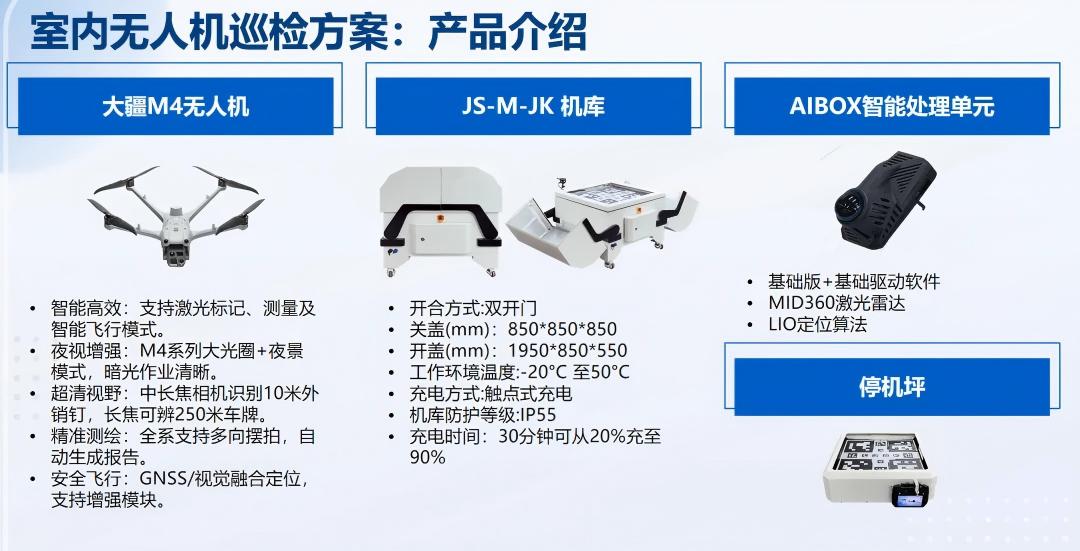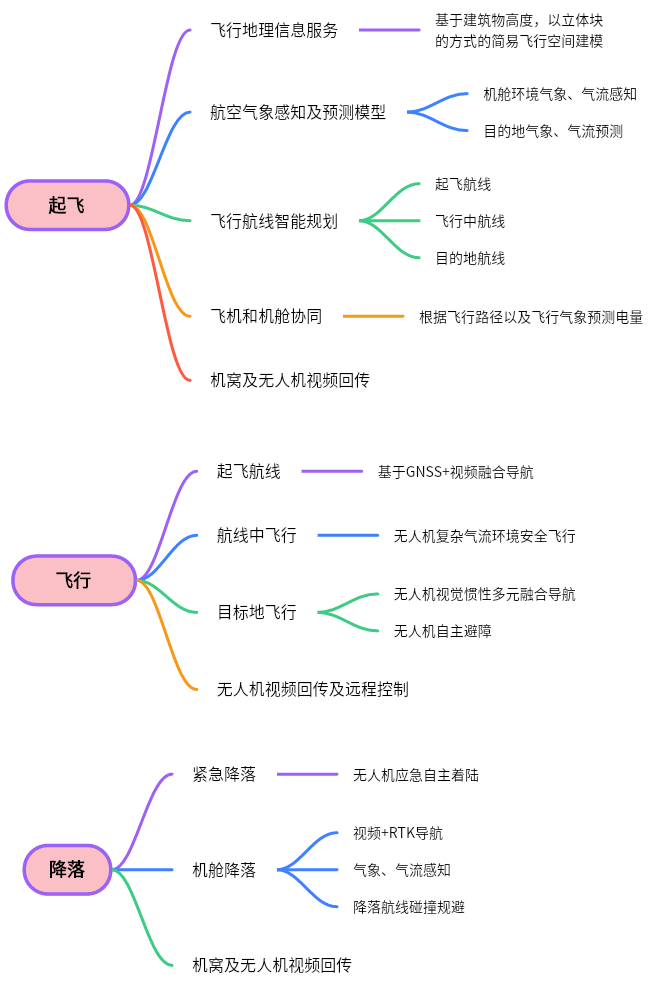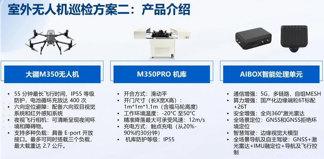 “大疆也认识到自身无人机避障能力的局限性,在今年最新的机型M4,就同步推出了激光雷达+毫米波雷达的避障模块;另外在今年最新的农业植保机T100也配置了激光雷达+毫米波雷达的避障模块;行业机搭载激光雷达+毫米波雷达实现避障增强应该的行业无人机的趋势”大疆目前还提供支持M350的多旋翼无人机的机场,需要第三方机场配合使用。另外,大疆解决方案不支持多机多巢以及多机的编队飞行。很多适合无人机任务执行的环境复杂,期望尺寸相对小(M350有些大)、另外结合环境(可能需要补光)以及任务目标,需要搭载不同的挂载设备(比如一些气体或者雷达探测设备),对于无人机的载重有些要求。此外复杂环境的飞行往往是超视距飞行的,无线通信是个挑战。此外飞行时间也是个不小的问题,除去往返飞行的时间,十几分钟的飞行根本没有办法达到执行任务的目的。总而言之,大疆无人机解决方案已经满足大多数的场景需求,在针对行业用户的需要,需要通过AIBOX、机场、平台,增强解决方案,提供用户行业特色的无人机自主巡检解决方案。