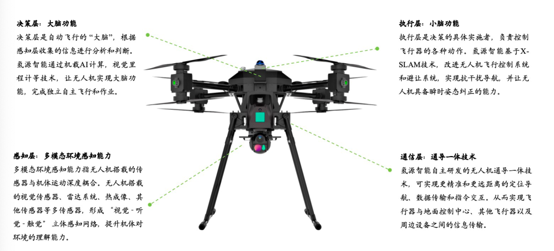 目前大疆的无人机除了M4以外,其他机型并不具备具身智能的能力。目前大疆的无人机只是高性价比的通用飞行器,还不能称之为具备具身智能的人工智能的无人机。“关于这一点其实也很好理解,具身智能的智能体一定是在特定的场景和需求背景的自主人工智能,需要用户定制开发”无人机的具身智能技术核心在于通过无人机机体与环境的深度交互,构建感知、决策与行动一体化的闭环智能系统。这一技术突破打破了传统无人机依赖预设指令或远程操控的局限性,使无人机能够像生物机体一样,通过物理形态的动态调整与环境实时互动,实现自主适应复杂场景的能力。简单来说,就是让无人机实现更“智慧”的飞行。L4级自主飞行系统指能够在无卫星信号、强电磁干扰环境下实现自主避障和飞行,且飞行任务过程无需高精地图或预建模。采用边缘计算架构,将决策逻辑下沉至无人机端,实现 “感知 - 决策 - 行动” 的毫秒级闭环。L4级自主飞行系统要求无人机在感知层、决策层、执行层、通信层等多方位技术创新突破。“AIBOX采用全国产化的算力平台,提供了32T的边缘算力能力,支持YOLO甚至CLIP视频大模型边缘AI的部署。