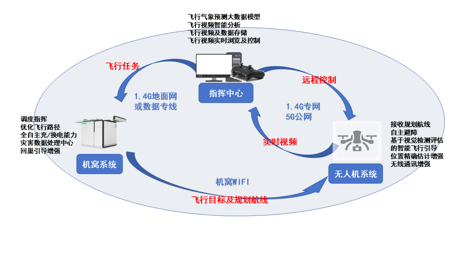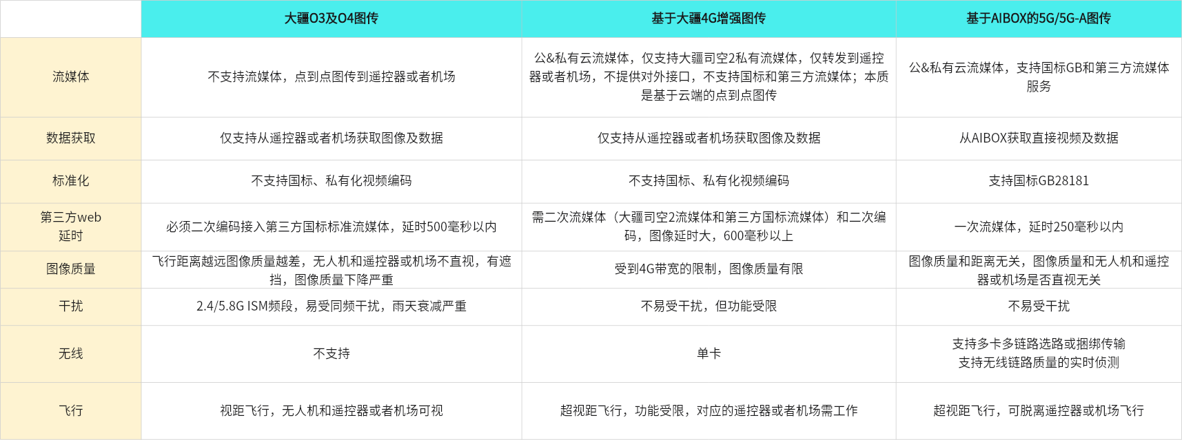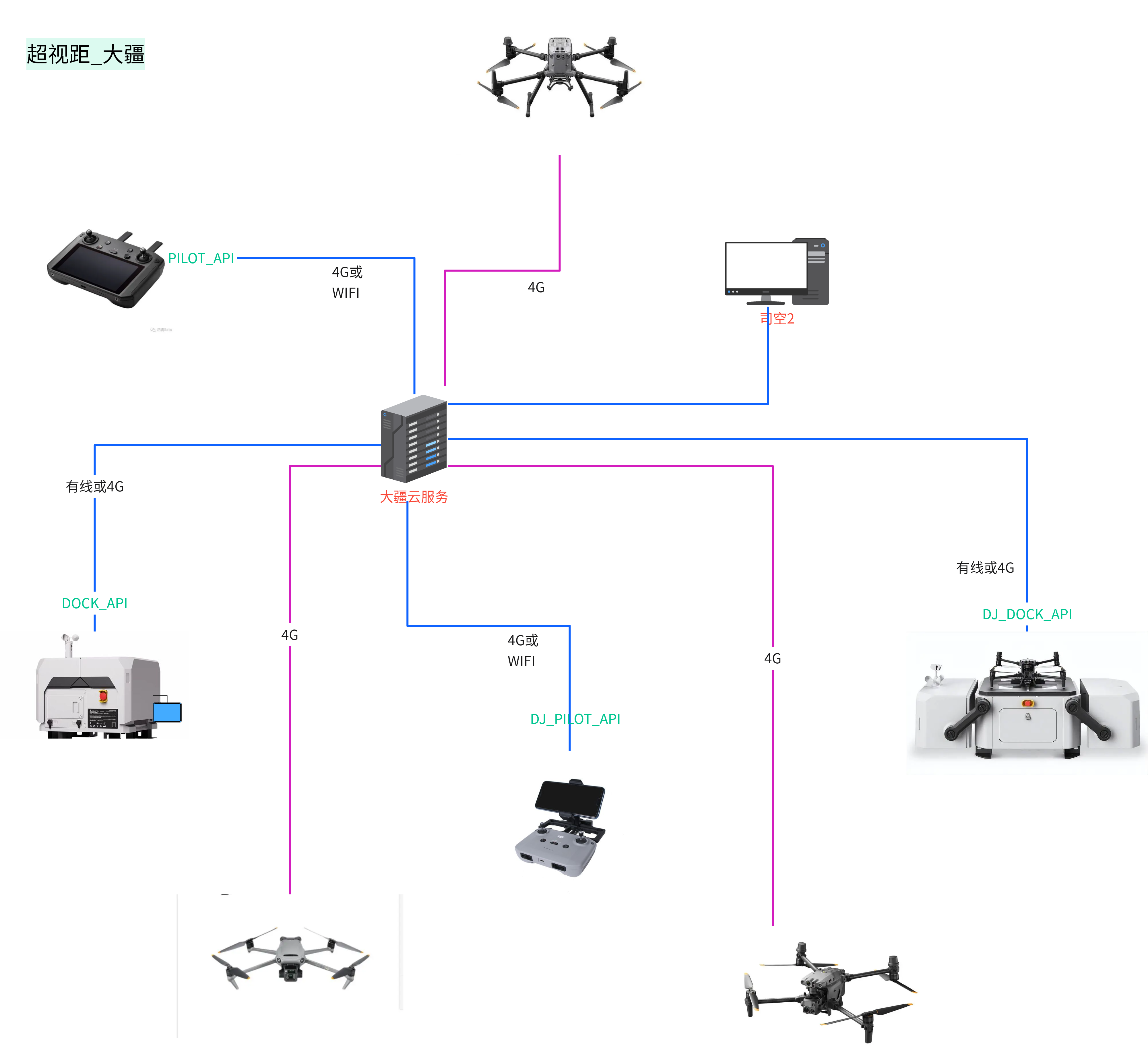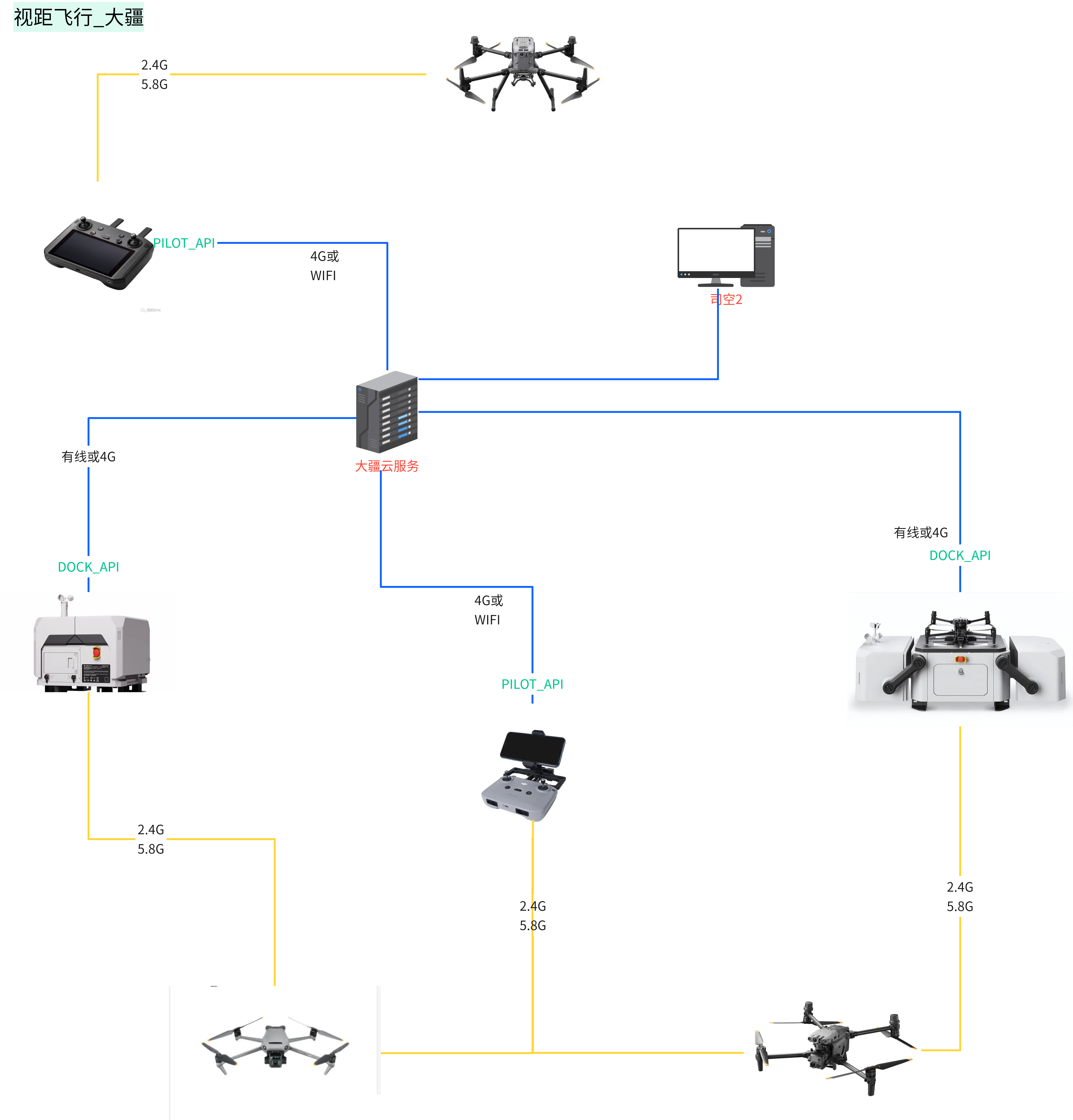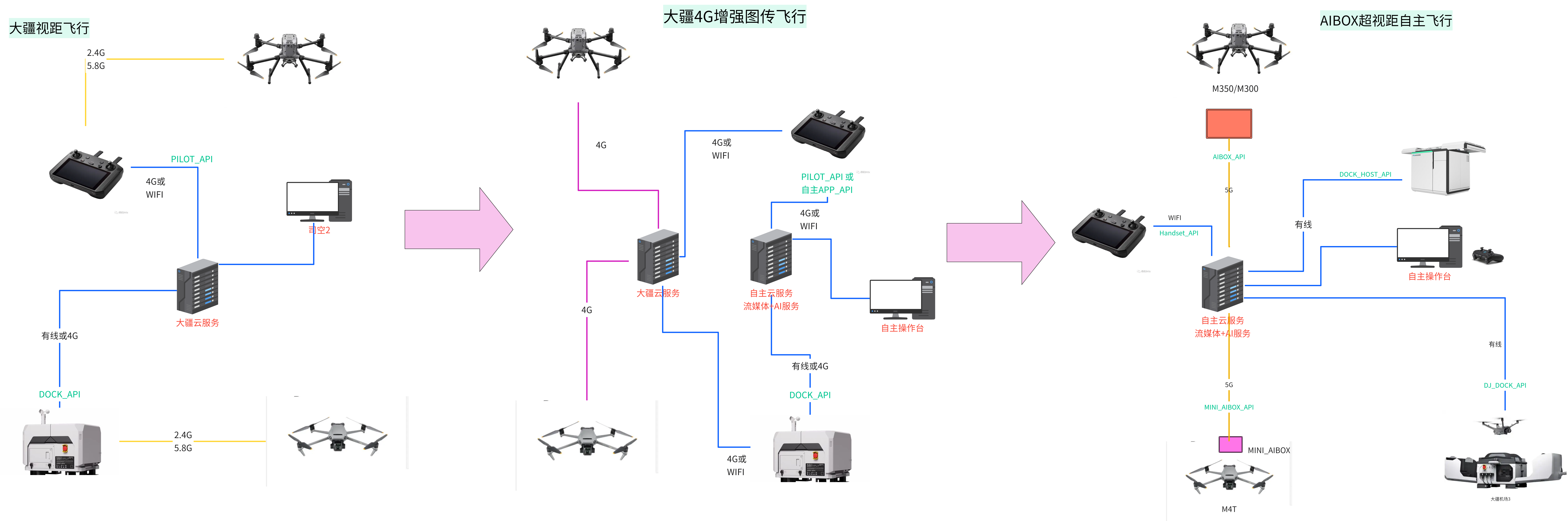 大疆无人机是低空行业无人机最具性价比的产品,尤其是大疆机场3的推出,以及持续自身产品升级迭代,包括司空2、大疆智图以及大疆智运等专业软件和各种功能强大的挂载及大疆生态合作伙伴的加持,构筑了围绕大疆无人机从空中检查到空中测绘等行业应用解决方案。“大疆能提供完整的低空无人机巡检解决方案,满足了行业用户的普遍需求,具备很强的通用性特点。大疆方案缺少行业本身的特殊性,需要集成商结合行业用户的场景特点,提供具备行业特色的无人机巡检解决方案”大疆无人机的无线通信采用2.4/5.8G的点到点通信方式,实现无人机到遥控器或者机场的C2+实时视频流的无线通讯。C2:Command and Control (指挥和控制);C4:Command 、Control、Communication、Computer(指挥、控制、通讯、计算)消费级主要面对个人用户,以飞手手控为主,无需考虑无人机人工智能的需求。无人机和遥控器绑定的点到点的无线通信,已经满足用户需要,超视距飞行基本不需要。行业机应用就不同了,需要超远距离、超长时间,还有复杂环境飞行的要求。另外,从管理需求出发,除了现场以外还需要远程飞行监控要求。类似消费级的点到点的无线通信架构已经没有办法满足应用需求。这种点到点的无线通信设计实现了视距条件下远距离无线数据通信(超过20-30公里)。但是很多行业应用情况,无人机没有办法保证视距飞行,比如城市低空安防,无论是高架巡检、违停执法还是突发空中执法,很多情况都是超视距飞行;隧道环境中飞行,这种点到点的无线通信也不理想;工业环境中大的金属物体的遮挡也可能导致点到点的无线通信无法正常工作。点到点无线通信失效的一个重要后果就是导致无人机飞行控制失效。另外一个重要后果是当无人机基于RTK飞行的情况,无人机通过和遥控器的点到点无线通信链路获取差分数据信息。点到点无线链路失效也将导致RTK失效。尽管大疆提供了4G增强图传模块,但是模块只提供的实时视频流和部分C2功能,满足不了行业用户的完整超视距自主飞行的要求。基于大疆MSDK开发APP,利用遥控器或者机场上云API的解决方案,只实现了远程控制无人机的功能,但是依旧没有摆脱大疆无人机到遥控器或者机场的点到点的无线通信架构,依然没有办法解决超视距和复杂环境的自主飞行。“大疆无人机的无线通讯技术确实已很好的满足了消费级客户需求,当时对于行业客户无论从应用还是管理角度都有不足”大疆无人机和遥控器或者机场绑定的使用方式实际行业应用叶会带来很多局限性:比如一个遥控器无法控制多架无人机的编队飞行、也不支持一机多巢或者多机多巢等等。1:基于机载AIBOX的PSDK开发,具备了完整独立C2及C4的能力,以及实时视频流低延时的无线传输是行业无人机应用的技术趋势。