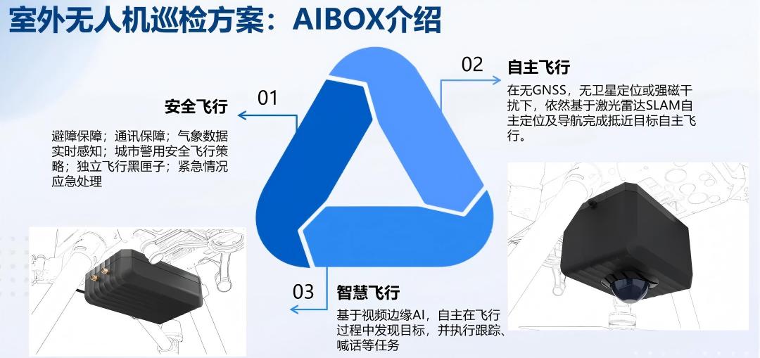 人工智能的无人机首先要求无人机本身具备处理神经网络算法的算力能力,同时也结合应用场景定制边缘AI算法。通过人工智能无人机实现高效的飞行任务。从大疆M4,我们已经看到这种无人机发展趋势,大疆也设计算法框架,鼓励生态合作伙伴定制开发边缘AI算法。当然这种边缘AI算法往往和无人机的飞行紧密结合,实现完整的飞行逻辑。准确的位姿是无人机或者机械狗稳定运动的重要保障。大疆无人机的位置数据是通过GNSS和RTK获取的。在GNSS拒绝环境以及室内环境,大疆无人机没有办法获取位置数据,只能采取手动飞行。室外高精度位置一般基于RTK获取,大疆无人机支持采用千寻的RTK差分基站,购机的费用包含了一年的RTK费用,后续需要购买服务。对于行业无人机的空中航线巡检,启用RTK是必须的。所以不同于M3,从大疆最新的M4机型来看,RTK已经是必配的模块,当然消费机没有这么苛刻的要求。大疆RTK有个使用局限性:RTK的差分信息是通过遥控器或者机场和无人机的点到点的无线通信发送给无人机的,这种通信方式在一些场合并十分可靠。大疆的D-RTK2的自主差分基站实高精度的地基RTK定位,从D-RTK3起,同时支持星基RTK定位。RTK定位的原理是RTK模块和差分基站需要至少共6颗GNSS卫星。由于无人机是高空飞行,采用星基似乎可靠性更高些的。在室外RTK无法收敛的环境,就需要其他定位技术来保证无人机可以得到高精度的位置信息。类似多源融合的SLAM定位或者协作定位的技术,用于解决这些场景的位置服务问题。大疆所有系列的无人机都仅仅支持RTK的飞行,在RTK无法收敛或者GNSS拒绝的环境,目前大疆还不支持这种场景的自主飞行,只能依靠飞手手动飞行。这对于很多行业应用客户而言是没有办法接受的。室外的姿态信息一般会基于IMU和陀螺仪获得,这在强磁的环境会失效。对于M350的中型无人机,可以通过双RTK更加可靠的获得,且不受强磁环境影响。但是其他包括最新的M4机型就没有办法解决这个问题。此类问题也是类似宇树机械狗面临的同样问题,考虑到机械狗地面运动,RTK以及陀螺仪受到的影响会更大。大疆无人机完全不支持室内的位姿服务,因此目前大疆无人机的所有系列都不支持室内自主飞行。对于室内环境,RTK是完全不可用的,陀螺仪也基本没有保证的。目前大疆的所有系列无人机在室内只能是飞手的手动飞行。这对于行业应用而言是无法接受的。室内无人机自主飞行比较成熟的技术路线是:首先对于飞行控制实现高精度的激光雷达3D点云建模;其次是将已建立的点云存储在无人机上;无人机在飞行中基于LIO里程计和3D点云比对,实现3D空间的高精度定位。另外一种方案就是在室内建立高精度的3D定位系统,协作无人机的高精度位姿服务。但是两种方案都是已知环境的飞行,需要对环境测绘或者部署定位设备,似乎都不太友好。另外由于基于激光雷达的方案需要加载激光雷达,会导致本来室内小型无人机飞行时间大大缩短,执行效率降低。目前还没有特别完美的室内无人机自主飞行的方案。尽管大疆在可见光以及激光雷达相关的挂载已经很齐全了,但是涉及类似工业设备的超声波、磁力仪等专业传感设备依然缺失。如何快速的将现有成熟专业的传感采集设备集成到无人机平台,也是一个重要的行业应用需要。“AIBOX提供了独立对外供电以及LAN、USB接口,方便集成传感采集设备”从成本和普遍性设计考虑,大疆无人机并没有特别考虑在复杂环境的飞行面对的飞行安全以及位姿数据的问题,需要用户在大疆无人机基础上增强和提升。M350 RTK配备六向视觉系统和六向红外传感系统,为飞机提供定位和环境传感功能。视觉系统通过视觉图像感测障碍物并测量距离,以获得有关飞机的位置信息。它们位于飞机机身的前部、后部、左侧、右侧、顶部和底部,每个都由两个摄像头组成。红外传感系统可以通过红外测距判断障碍物的距离,还可以提供飞机的地面高度参考,并通过视觉系统的视觉计算飞机的位置信息。视觉避障功能适用于良好的照明环境,飞行路线中遇到的前方障碍物不应特别稀疏。此外,由于惯性关系,有必要将飞机的制动控制在有效距离内。红外传感系统使用场景红外传感系统适用于漫反射、大尺寸、高反射率障碍物的环境。
