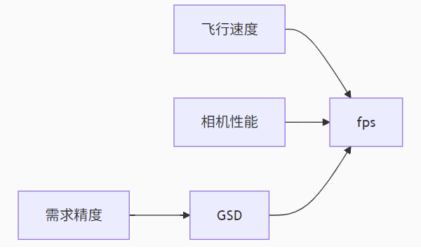拍摄频率(fps)= \frac{飞行速度(m/s) × (1 - 航向重叠率)}{GSD(m/像素) × 传感器高度方向像素数}关键参数关系: