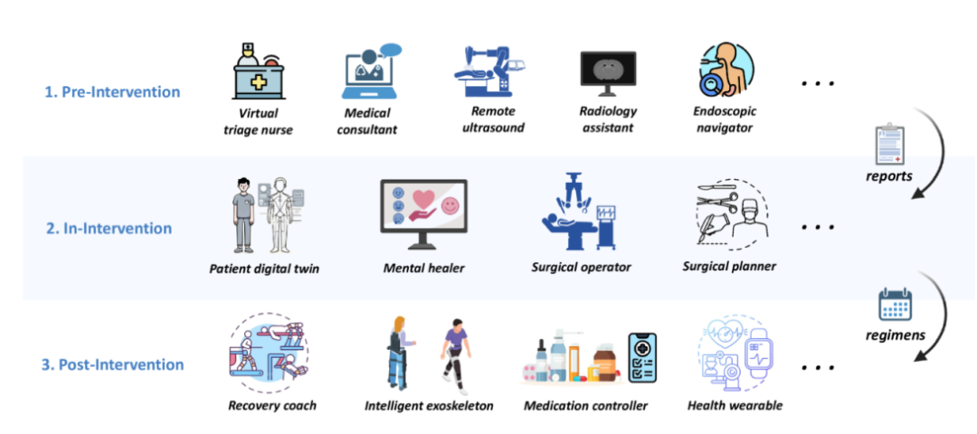 具身智能系统已广泛应用于临床干预的整个周期,包括干预前(Pre-Intervention)、干预中(In-Intervention) 和 干预后阶段(Post-Intervention)。